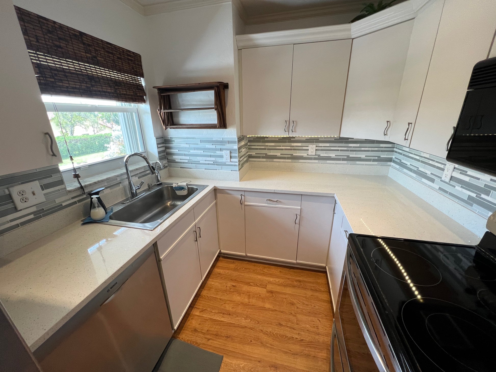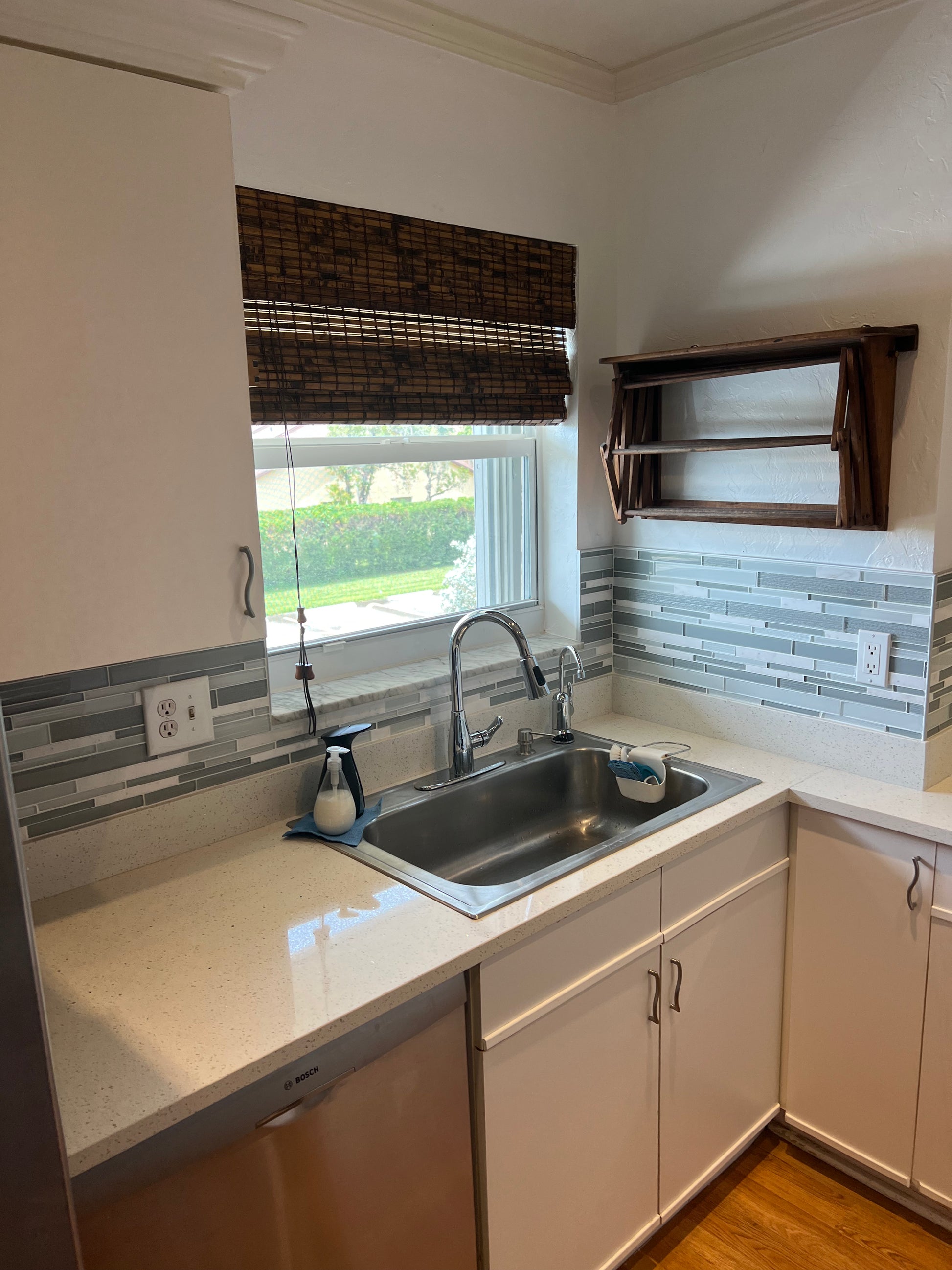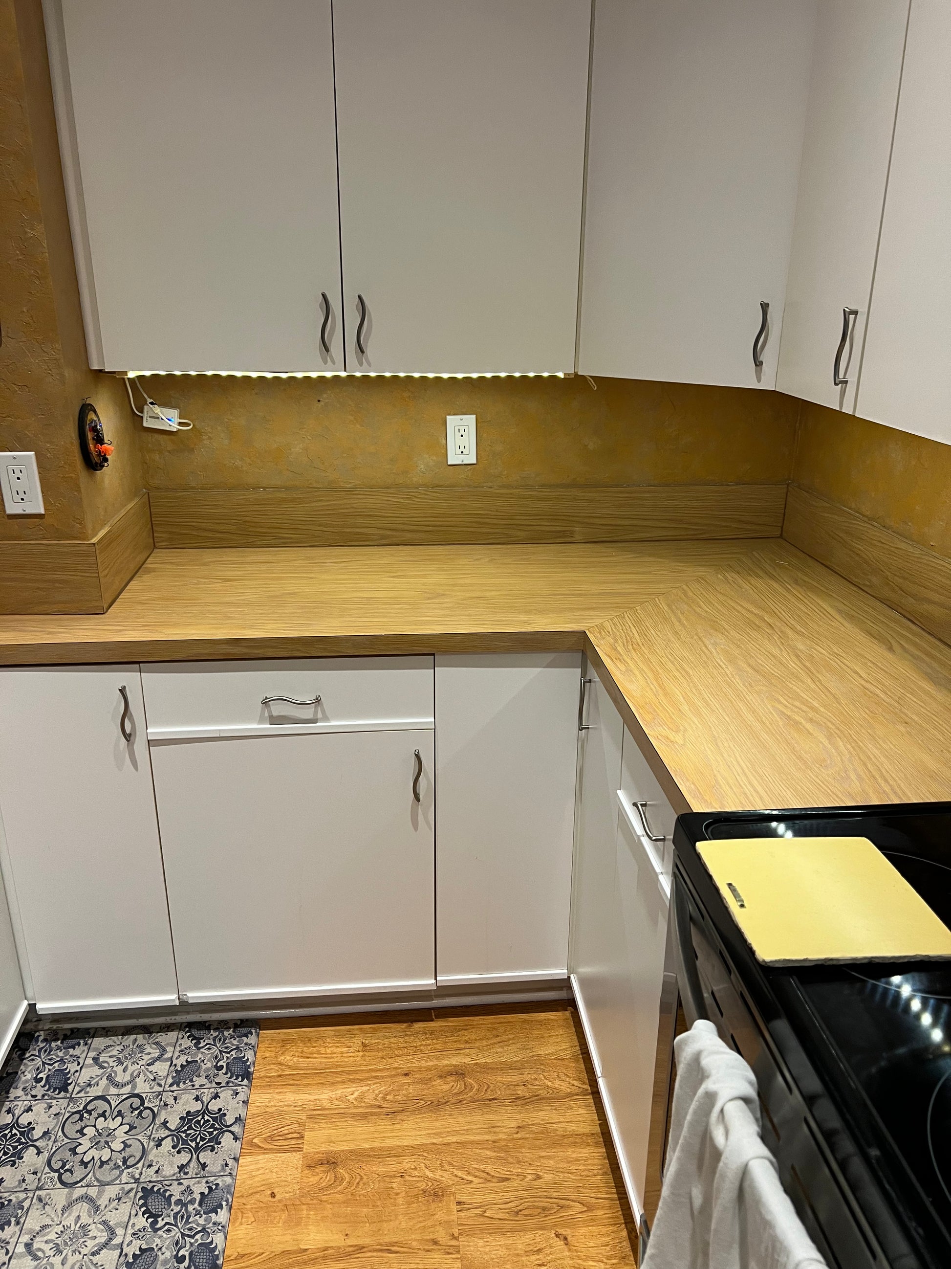 In this kitchen transformation, we replaced an outdated wooden countertop with a sleek, modern white marble surface, instantly elevating both the look and function of the space.