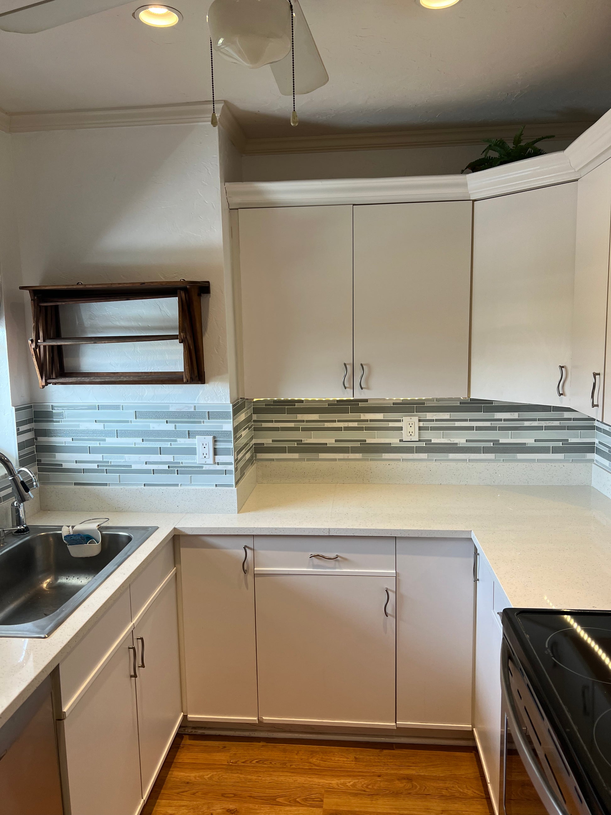 Combined with refreshed lighting and minimalist hardware, this upgrade gave the kitchen a refined, airy aesthetic while significantly enhancing durability and usability.