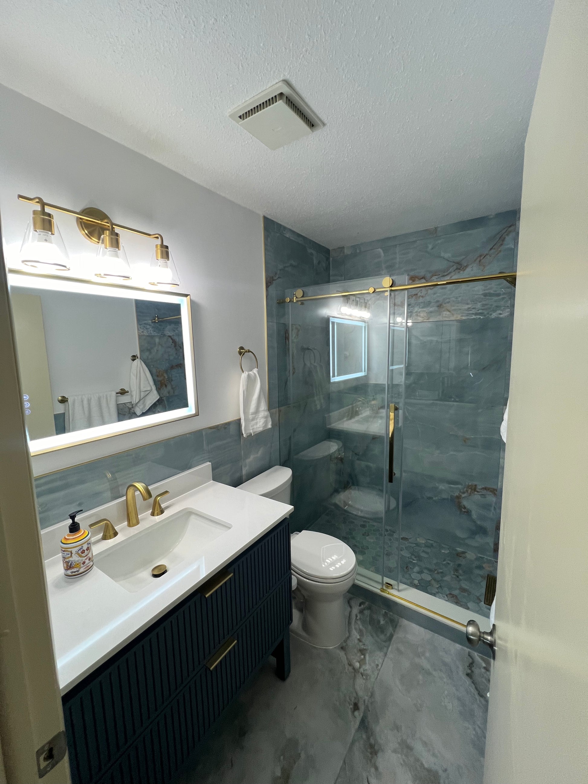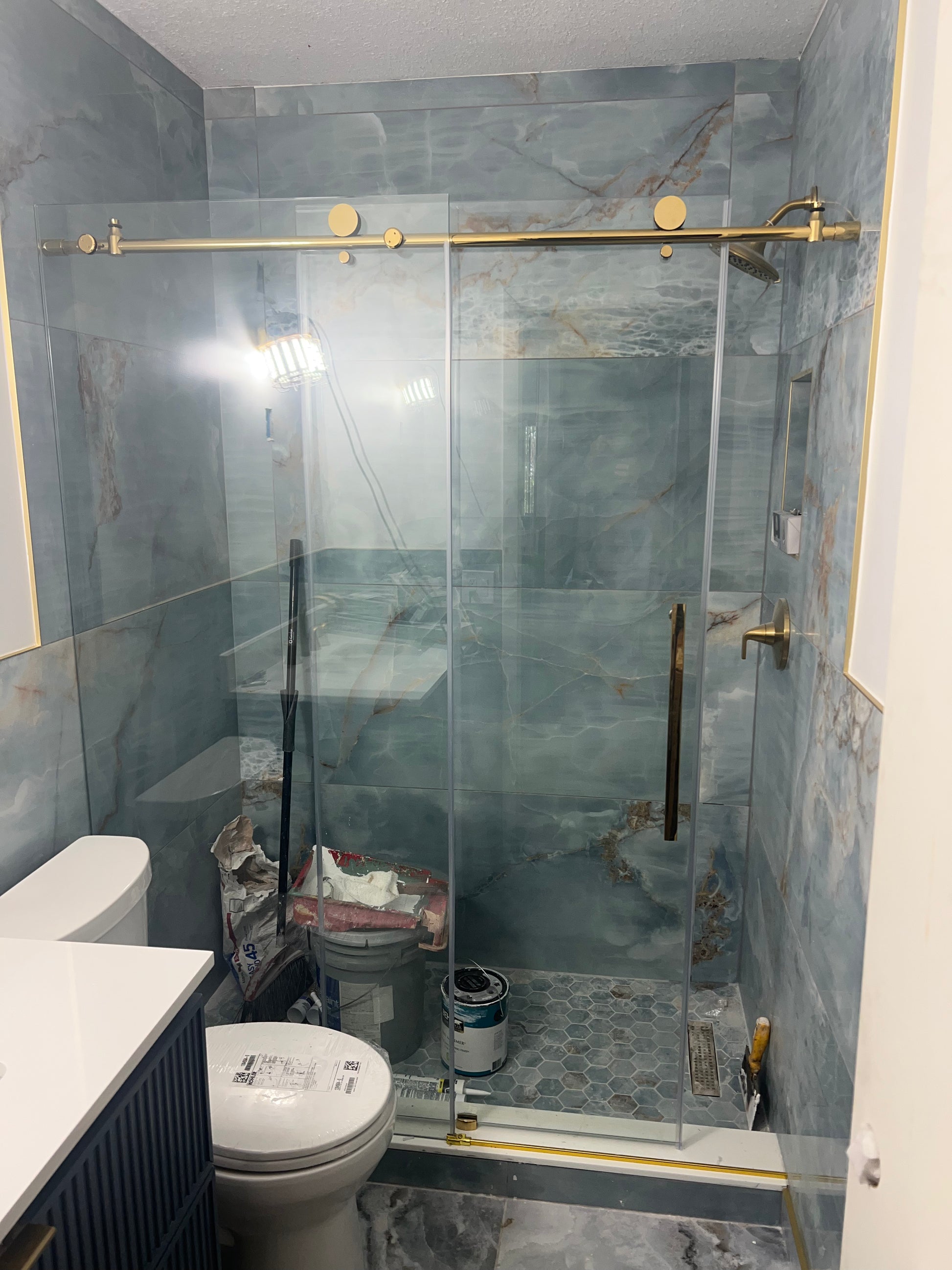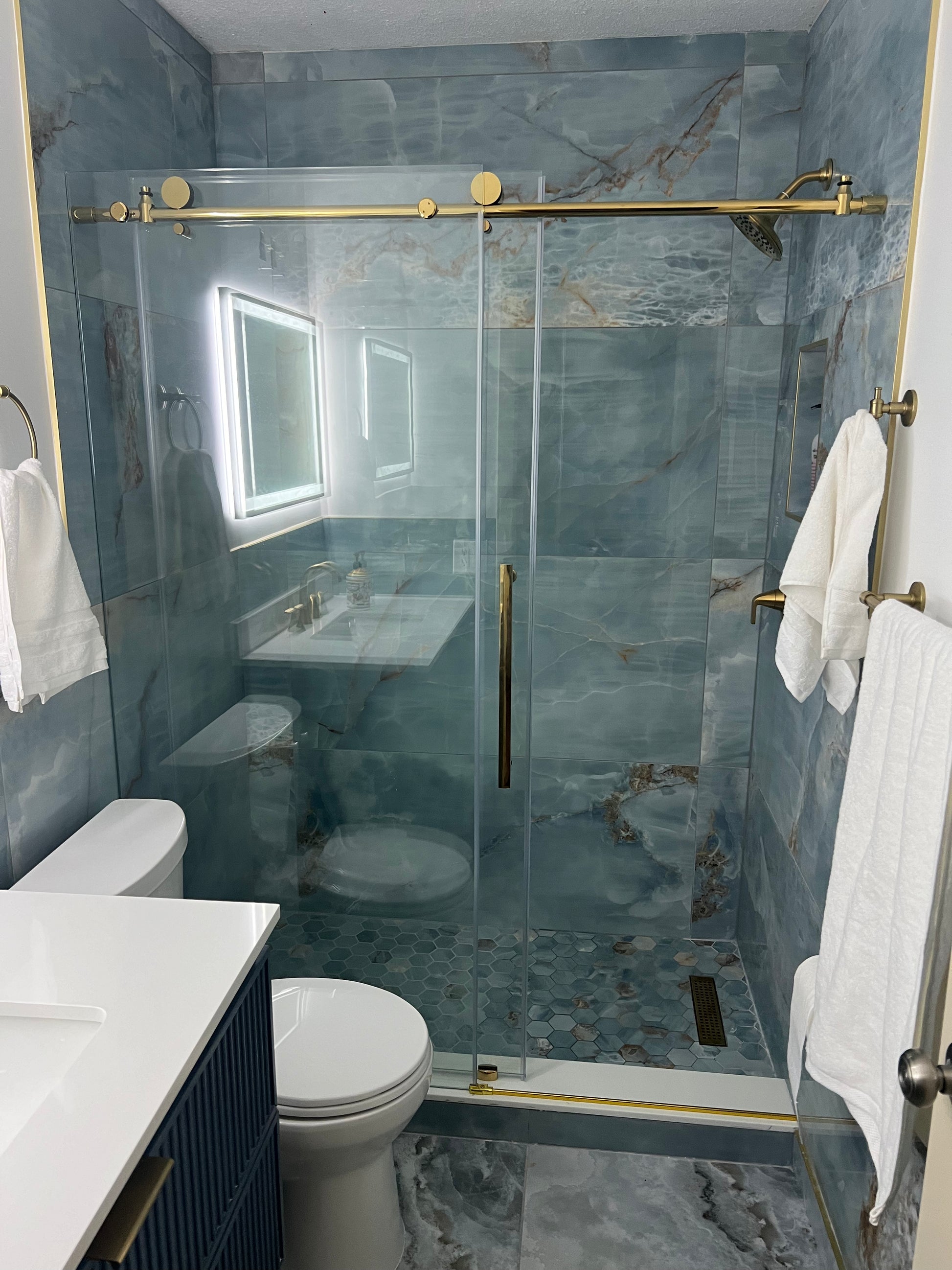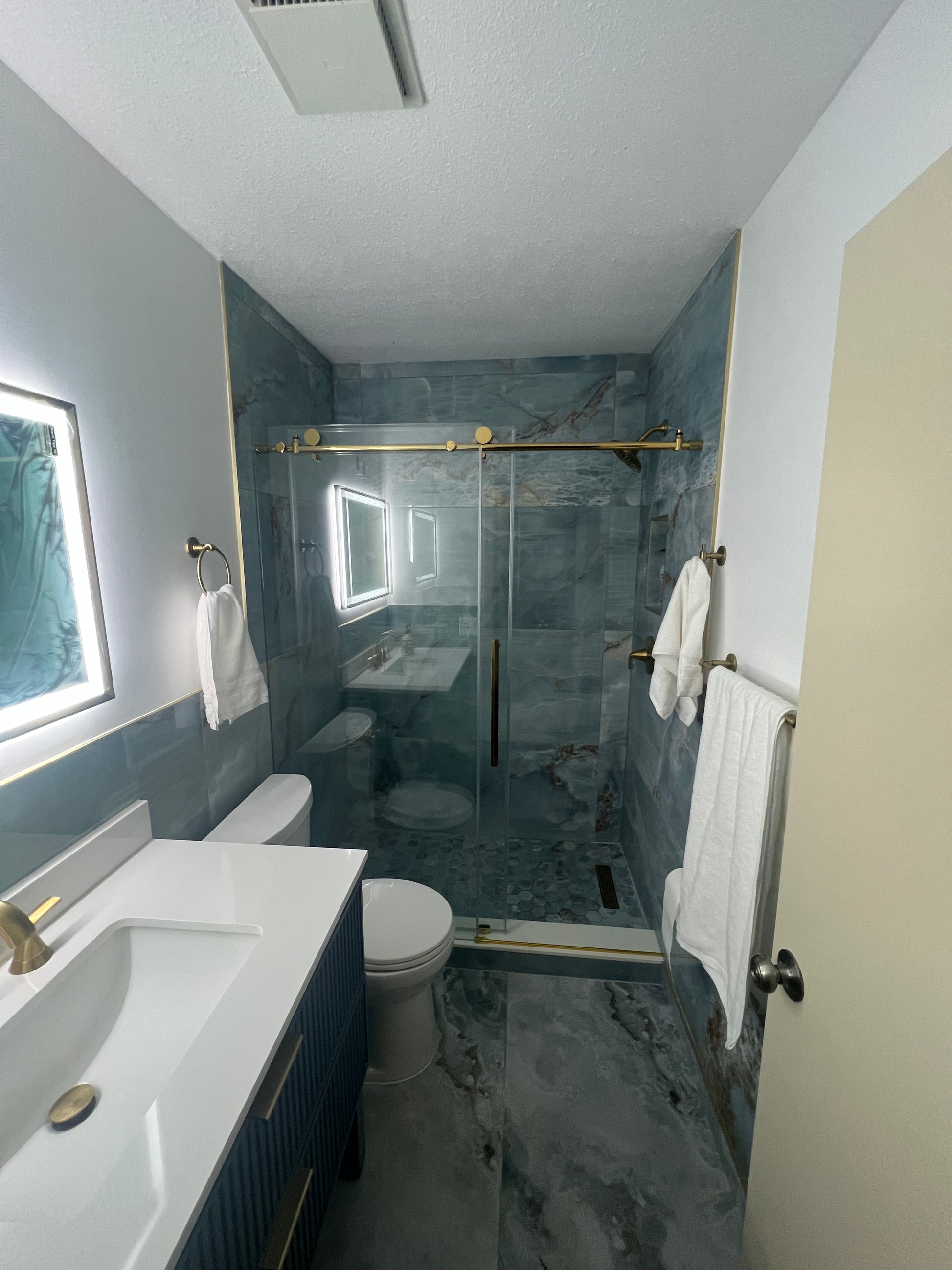 We completed the transformation with modern lighting, a floating vanity, a frameless glass shower enclosure, and high-end finishes that deliver both style and functionality. The final result is a space that not only reflects the client’s vision but also showcases our team’s commitment to quality, elegance, and detail.